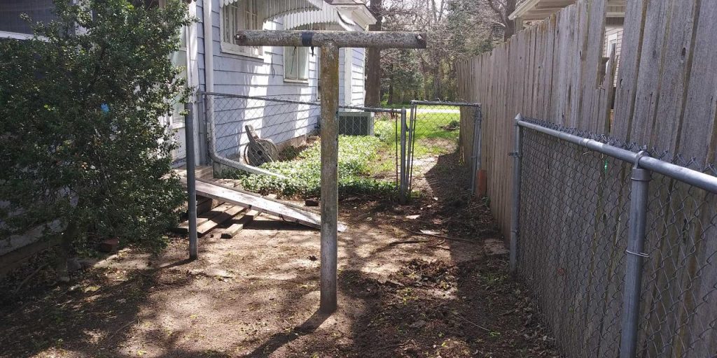My assistant Cathleen had a vision for creating a safe place in the small back yard for her young daughter to play. This vision included a trampoline and swing set. The problem was two clothesline poles in the way. Compounding the problem…they were set in concrete.